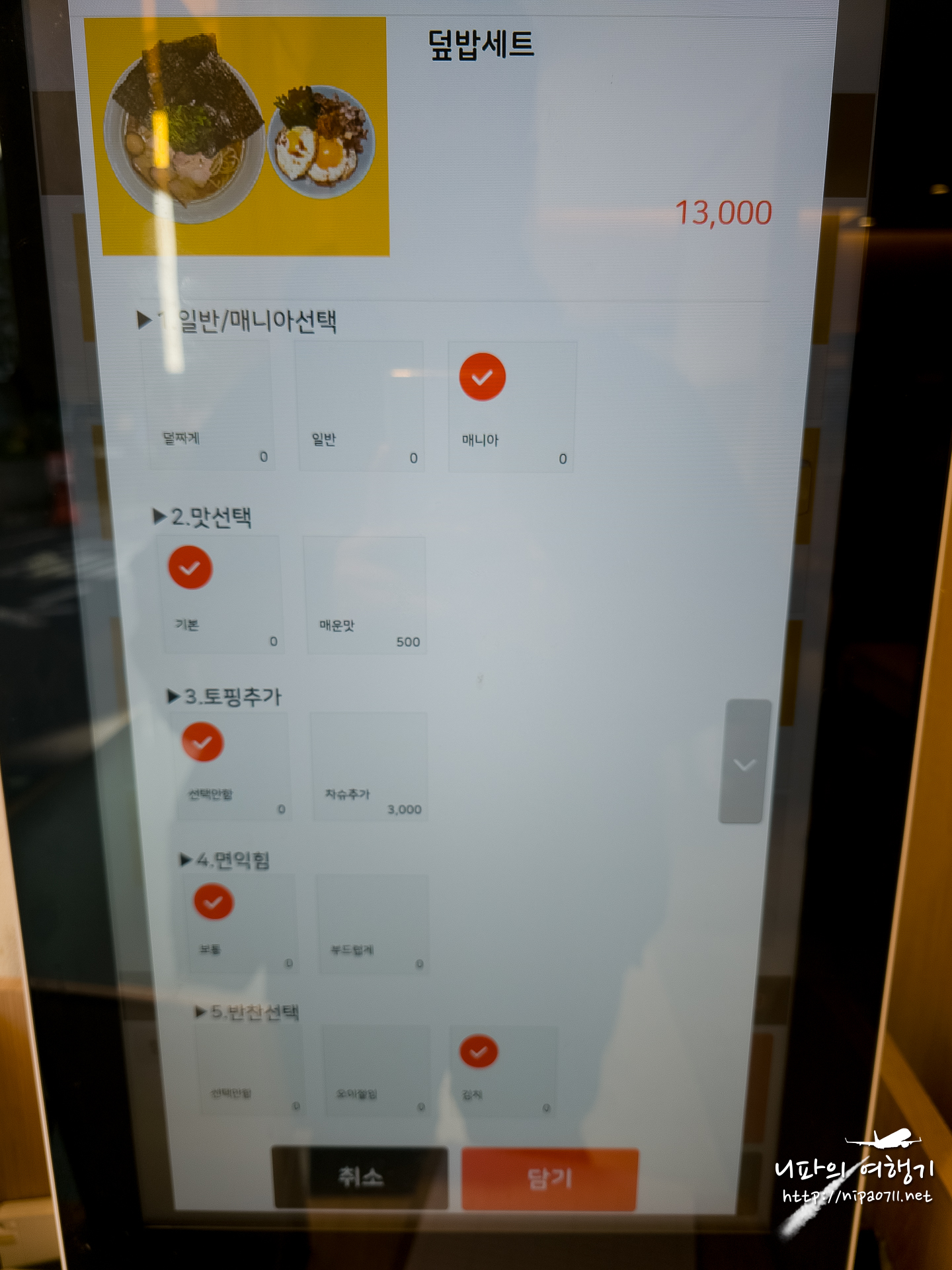 선택한 옵션은 매니아/기본맛/토핑추가안함/면익힘-보통/반찬은 김치 되겠습니다.