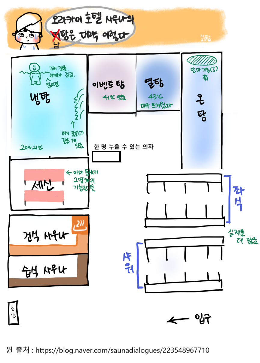 제가 가기 전에도 참고한 곳이긴 한데, 멀어도 간다. 청계산 오라카이 호텔 사우나 : 네이버 블로그 여튼 구조는 여탕과 반대 입니다. 여탕 이미지 갖고 와서 반전 시켰는데, 대략 위와 같은 구조 입니다.