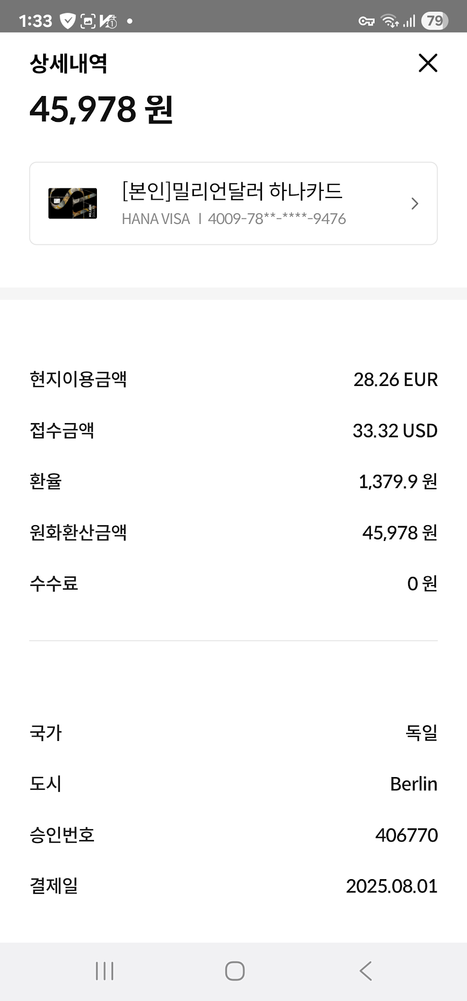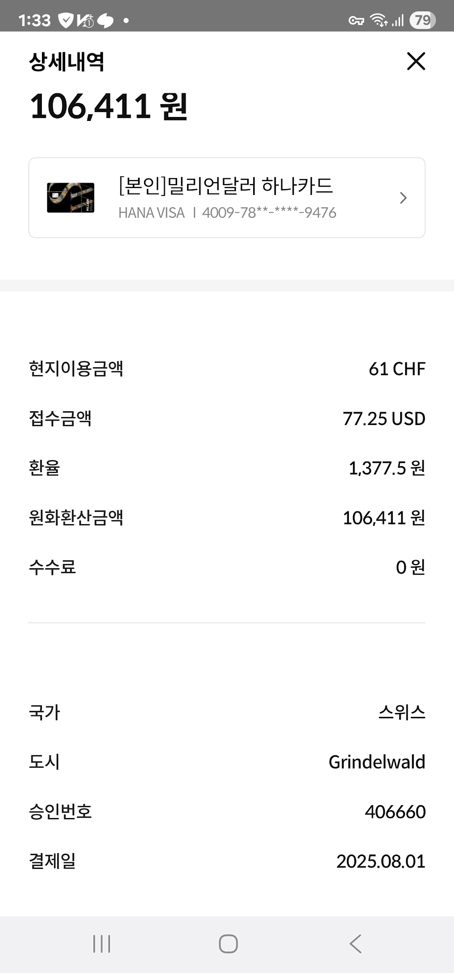 제가 실제 이용한 금액은 현지에서 61 CHF와 28.26 EUR 입니다.