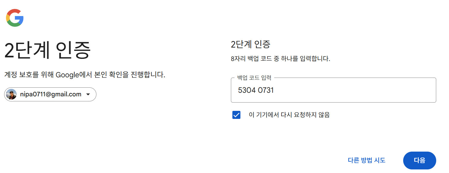 이제 이 백업코드를 이용해서 로그인을 시도해봅시다.