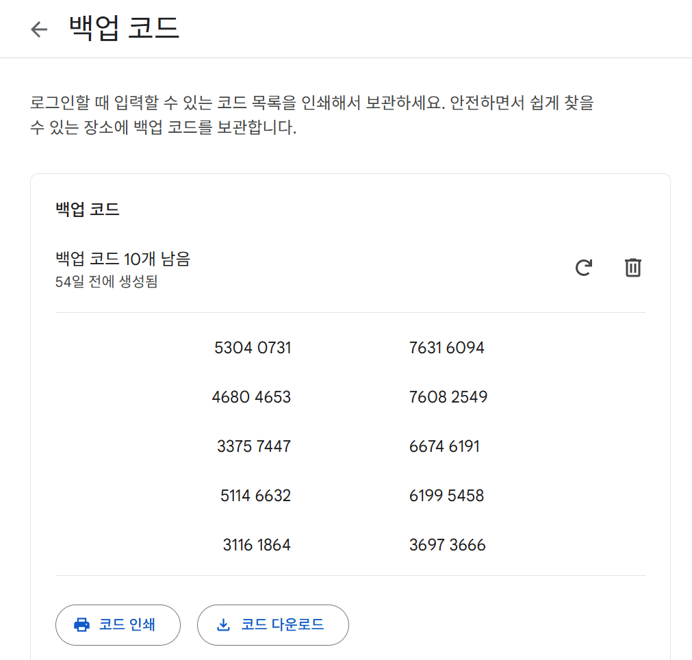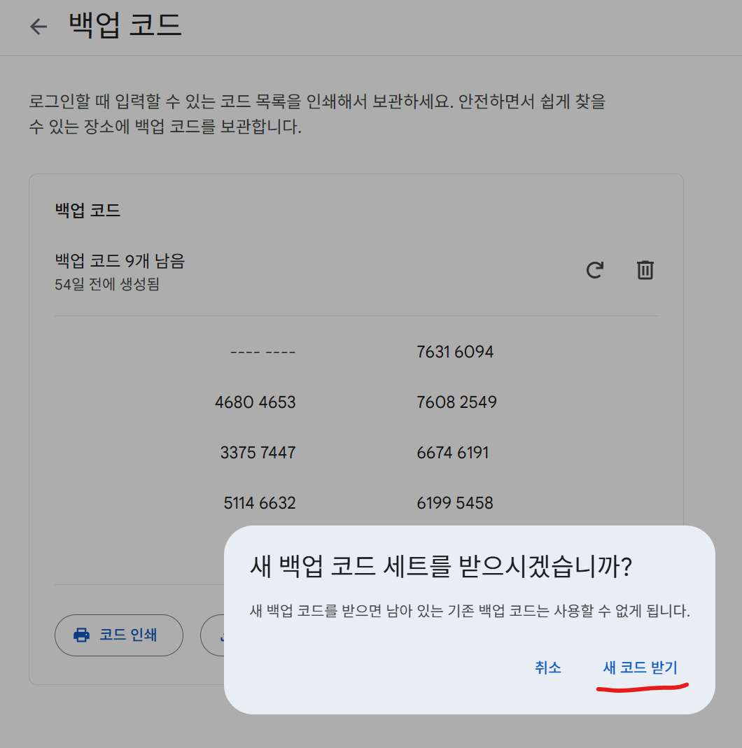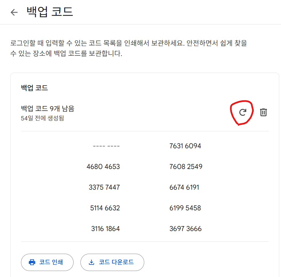 그 아래쪽에 보면 백업 코드 라는 것이 있습니다.