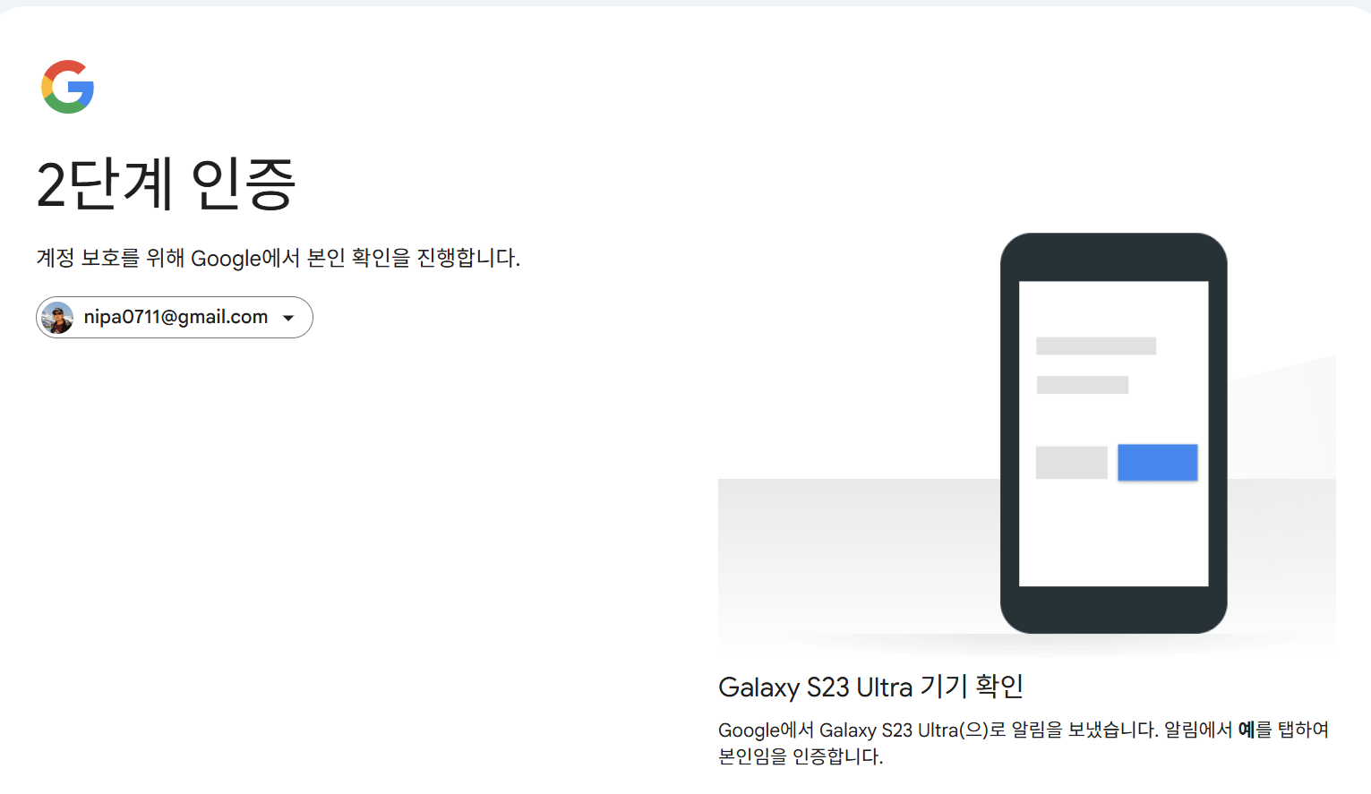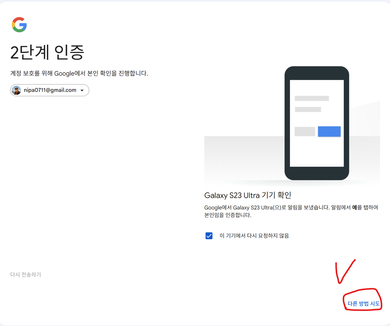 그리고, 지금 여러분은 휴대폰이 분실된 상태에서 구글에 로그인을 시도하고 있습니다.