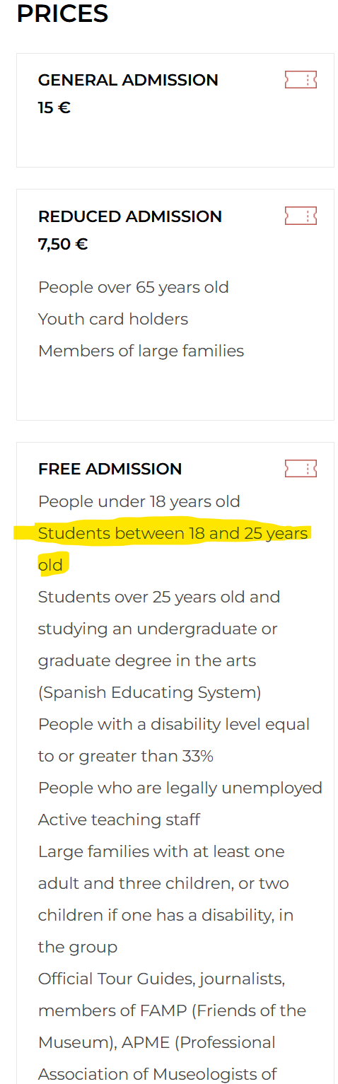 마드리드의 프라도 미술관의 경우 25세 이하 학생의 출입은 무료 입니다.