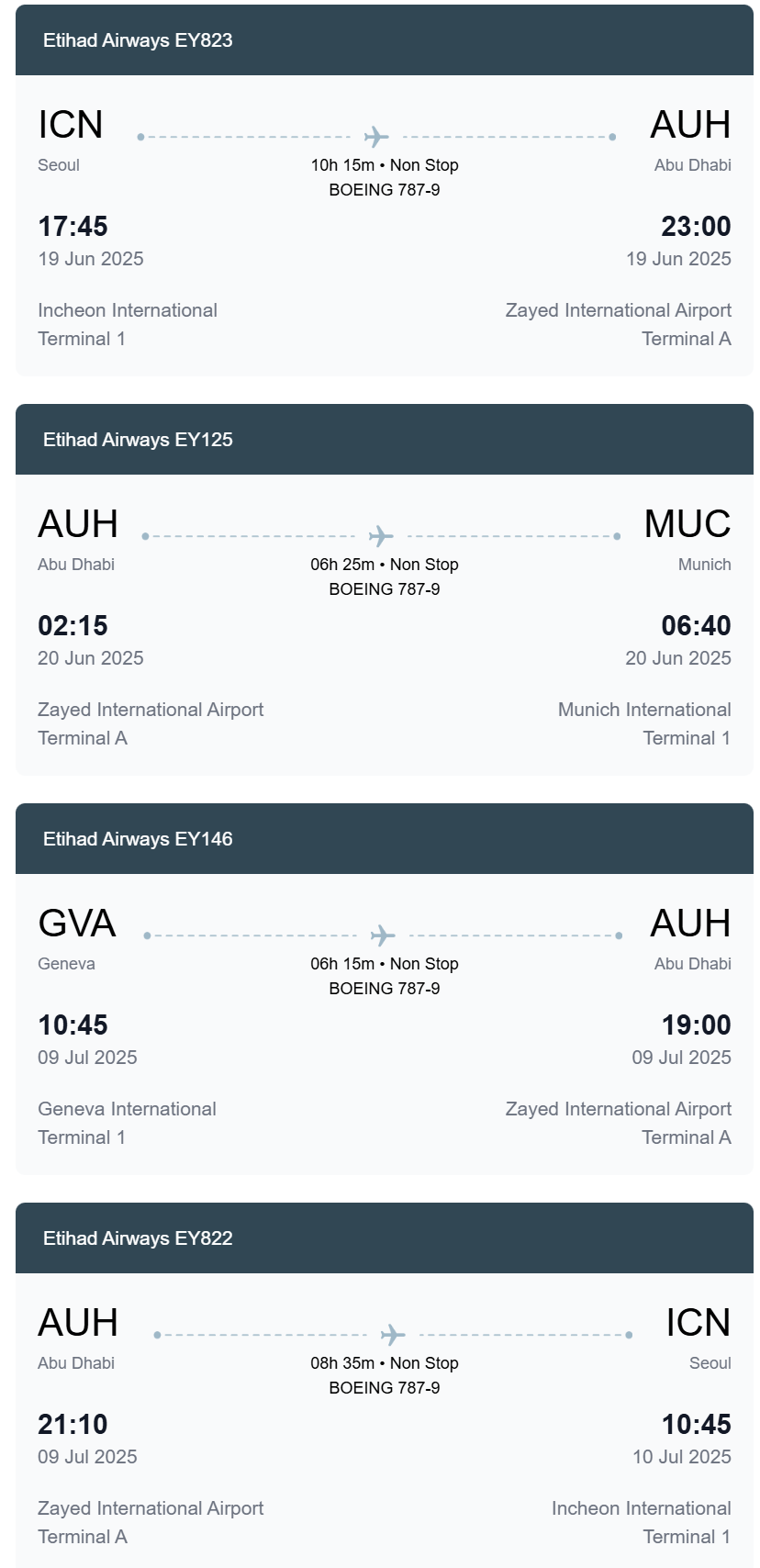 이번에 제가 탑승한 비행기 인데요, 인천 -> 아부다비 환승 -> 뮌헨의 경우를 보겠습니다.