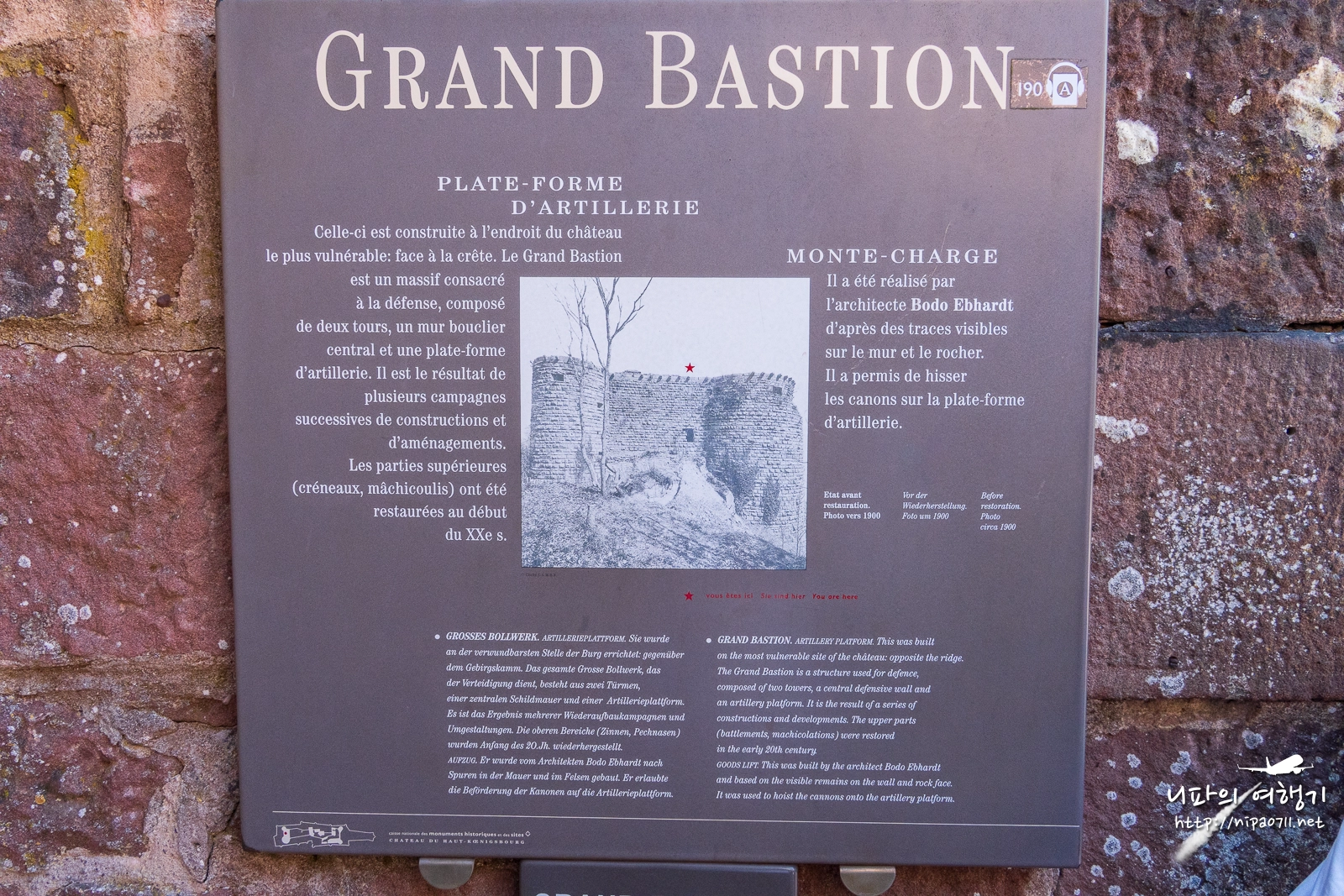 원문 : GRAND BASTION. ARTILLERY PLATFORM. This was built on the most vulnerable site of the château: opposite the ridge. The Grand Bastion is a structure used for defence, composed of two towers, a central defensive wall and an artillery platform. It is the result of a series of constructions and developments. The upper parts (battlement, machicolations) were restored in the early 20th century. This was built by the architect Bodo Ebhardt and based on the visible remains on the wall and rock face. It was used to hoist the cannons onto the artillery platform.