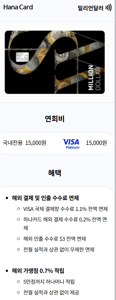 해외에서 달러(USD)로 결제되는 해외사용 필수템! 밀리언달러 하나카드 는 하나카드 가 하나은행 과 협업하여 출