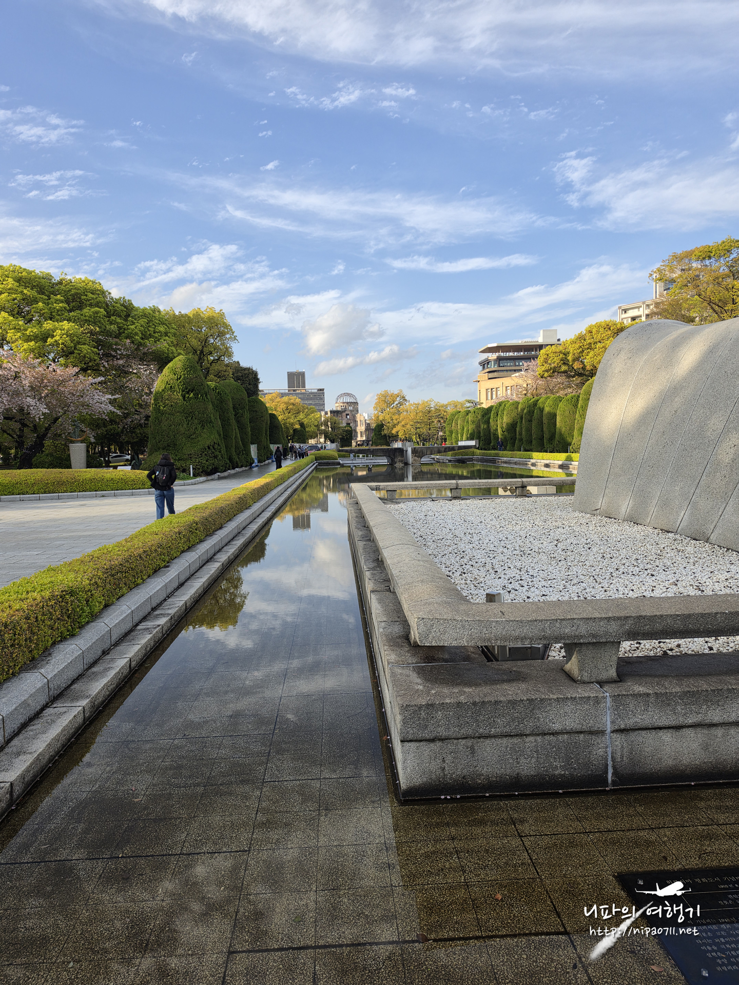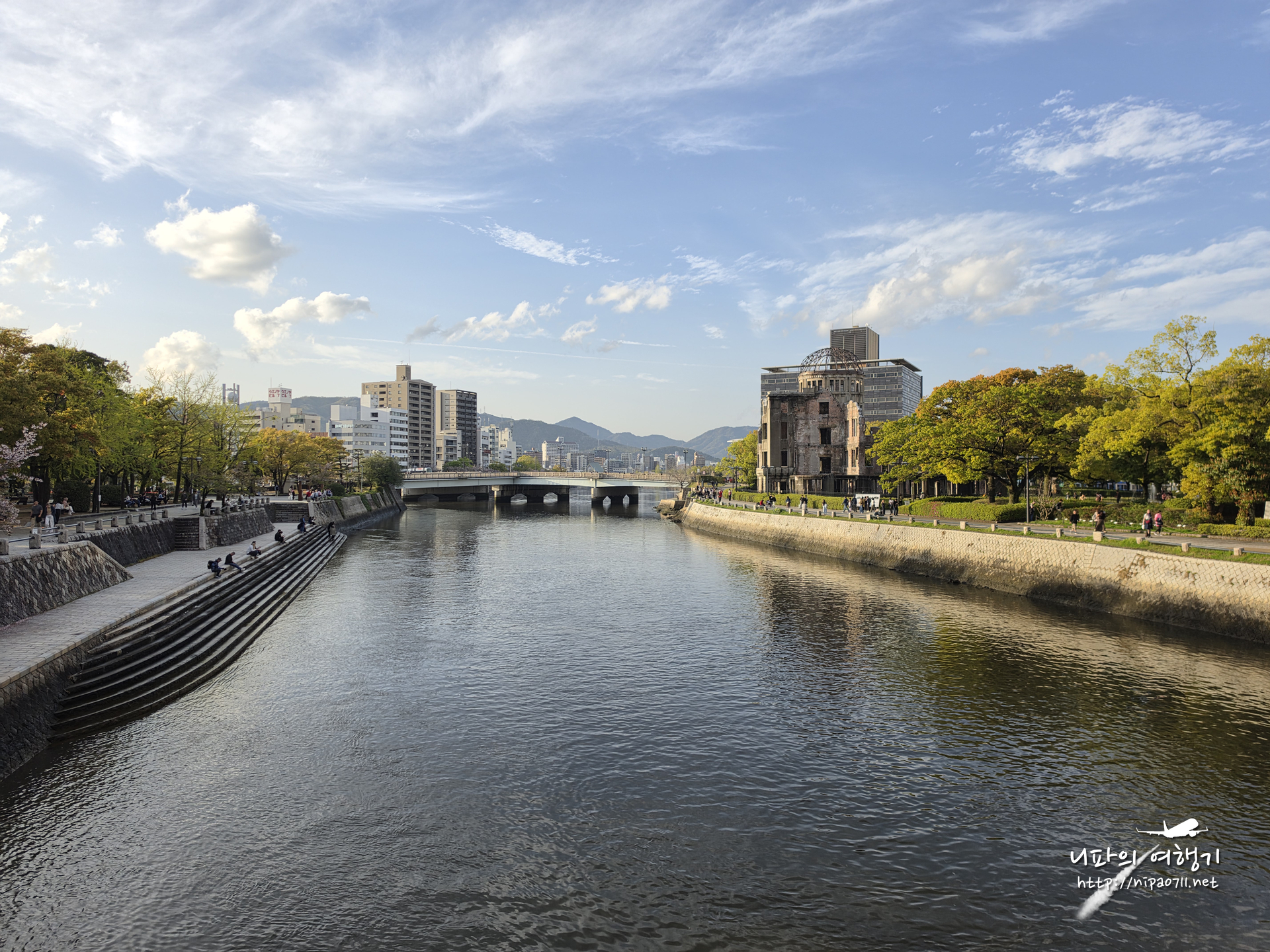 다리 하나를 사이로 히로시마 평화기념공원과 원폭돔이 나뉘어져 있습니다.